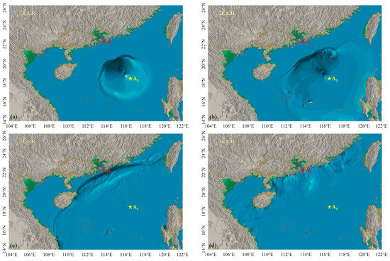 To investigate the propagation characteristics of the tsunami, Figure 7 shows the tsunami snapshots of BSC-1V at four moments. Half an hour later, a nearly circular tsunami-affected area is formed centered on the sliding site, and the principal propagation direction is from northwest to southeast (Figure 7a). After 1 h, the tsunami affects the coastal areas of the Philippines, and part of the tsunami continues to spread northwest (Figure 7b). About 3 h later, the tsunami strikes the southeastern coast of China and extends perpendicularly to the coastline (Figure 7c). After that, the tsunami wave reflection and refraction last for more than 4 h (Figure 7d).