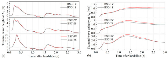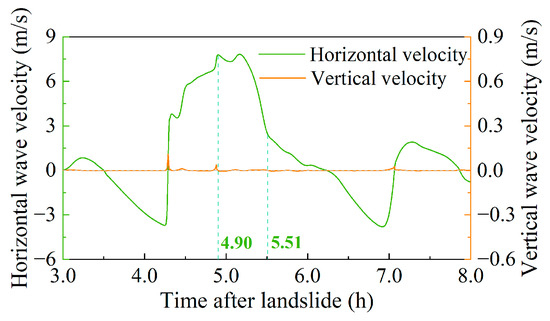 Figure 8c and Figure 9 show the evolution of wave height and velocity with time under BSC-3V. The vertical load is mainly affected by the wave height and vertical speed. Among them, the vertical velocity has a low temporal variability, and the vertical load’s velocity component (Equation (16)) is the second-order function of vertical velocity. Therefore, the vertical load will be mainly affected by the wave height. The lateral wave loads are primarily controlled by the wave height and horizontal velocity (Equations (9)–(11)), both of which have a high value. Thus, the wave height and horizontal velocity are the main parameters affecting the vertical and horizontal wave force. As shown in Figure 8c, the tsunami of BSC-3V is composed of a series of tsunami waves, and its peak time is 5.51 h. Moreover, the horizontal velocity peaks at 4.90 h. Therefore, we select the peak time of the wave height and horizontal velocity, respectively, and compute the wave force by the method shown in Section 2.2.