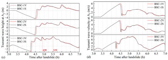 Landslide motions with different friction models will cause different tsunamis, and the height and velocity of waves are the most typical tsunami parameters. Figure 8 presents the tsunami wave height and velocity at two positions (A1 and A2). A1 is located southeast of the landslide area (Figure 7), which is the main direction of tsunami propagation. A2 represents the geographical location of the coastal bridge in Section 3.1. It can be seen from Figure 8a,b that in the main propagation direction of the tsunami, the first wave peak under the velocity-weakening basal friction model is higher than that of the static basal friction, and the wave velocity is always larger within 3 h. As shown in Figure 8c–d, the wave height at the bridge site gradually increases and fluctuates. The wave height under the two friction models alternately peaks. The wave velocity under BSC-1 and BSC-2 decays rapidly after reaching the ridge and then continues to rise for about 1 h. However, after a brief decline after the first peak, the wave velocity of BSC-3 rises rapidly and continuously to form a relatively stable peak interval (about 4.9 h–5.2 h).