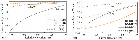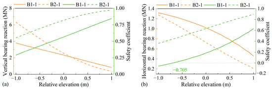 Bearing reaction and safety coefficient under different relative elevations: (a) Vertical; (b) Horizontal.