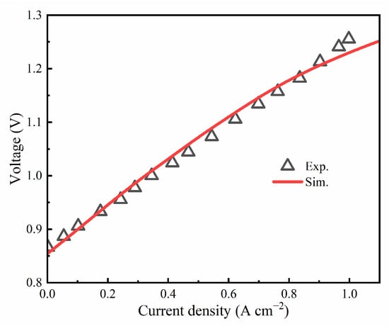 Four mesh systems were used to verify grid independence. The corresponding mesh numbers of the computational domain were 8800, 35,000, 88,000, and 144,000, respectively. The mesh number of 88,000 was selected for the numerical simulations. In addition, the accuracy of the model was verified by comparing the simulation results with experimental data. A SOEC with an active electrode area of 16 cm2 was used in the experiments. It had a Ni/YSZ electrode with a thickness of 10 mm, a YSZ electrolyte with a thickness of 10 mm, and a LSM electrode with a thickness of 15 mm. Experimental data were obtained when the SOEC was at 800 °C with 45% CO2, 45% H2O, and 10% H2 and pure oxygen at the cathode and anode sides, respectively. The model’s structural and operational parameters were consistent with those in referenced experiments [42,43,44]. Figure 2 shows the experimental and simulated polarization curves. The simulation results of the polarization curves shown in the figure are in good agreement with the experimental data, indicating the reliability of the mathematical model and calculation method used in this paper.