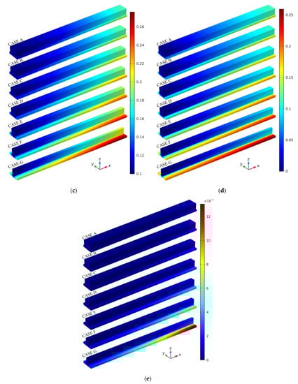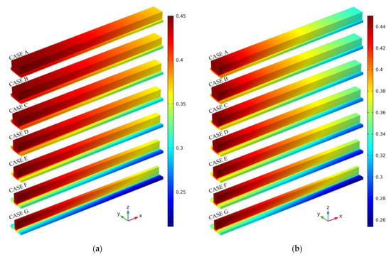 Figure 4 shows the mole fraction distributions of H2O, CO2, H2, CO, and CH4 in the cathode side of SOECs. In this figure, the x-axis is the direction of gas flow, the y-axis is the direction of cell width, and the z-axis is the direction of cell thickness. As shown in Figure 4a,b, the mole fractions of H2O and CO2 are gradually decreased along the channel direction. H2O and CO2 are consumed in the cathode active layer caused by the electrochemical reactions. The mole fractions in the porous electrode are gradually decreased as the rib width is increased. The minimum mole fractions of H2O and CO2 obtained by CASE G are 0.211 and 0.254, respectively. This is because the increase in rib width hinders the transport processes of H2O and CO2 from the flow channel to the active layer. As can be seen from Figure 4c,d, the mole fractions of H2 and CO are gradually increased along the flow direction, and the mole fractions of them in the support layer and active layer are higher than those in the flow channel. The mole fractions of H2 and CO increase with the increase in rib width, and the maximum mole fractions of them in CASE G are 0.276 and 0.259, respectively. It can be seen from Figure 4e that CH4 mole fractions in the active layer and support layer are gradually increased along the flow direction and are very low in the flow channel. The maximum mole fraction of CH4 is increased from 9.33 × 10−6 to 1.31 × 10−4 when the rib width is increased. These findings indicate that the reverse MSR reaction rate is very low.