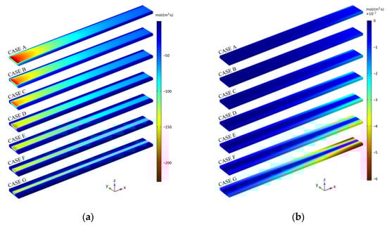 Figure 5 shows the reaction rates of WGSR and MSR of SOECs with different rib widths. The negative sign in the figure represents the reverse direction of reactions. As shown in Figure 5a, the reverse WGSR rate is decreased when the rib width is increased. When the current density is 1 A cm−2, the reverse WGSR rates of CASE A and CASE G are 49.82 mol m−3 s−1 and 22.52 mol m−3 s−1, respectively. As shown in Figure 5b, the reverse MSR reaction rate is increased with the increase in current density. Meanwhile, it is increased with the increase in rib width. When the current density is 1 A cm−2, the reverse MSR rates of CASE A and CASE G are 0.0041 mol m−3 s−1 and 0.0208 mol m−3 s−1, respectively. This is because that mole fraction of H2O is decreased and mole fractions of H2 and CO are increased as discussed above. Figure 6 shows the WGSR and MSR rate distributions in the porous electrode. In this figure, the x-axis is the direction of gas flow, the y-axis is the direction of cell width, and the z-axis is the direction of cell thickness. The reverse WGSR rate under the channel region is higher than that under the rib region, and the maximum reverse WGSR rate is observed at the entrance of the channel region. The maximum and minimum reverse WGSR rates of seven cases are 226.61 mol m−3 s−1 and 2.24 mol m−3 s−1, respectively. The reverse MSR rate under the channel region is lower than that under the rib region. The reverse MSR rate under the rib region is gradually increased when the rib width is increased.