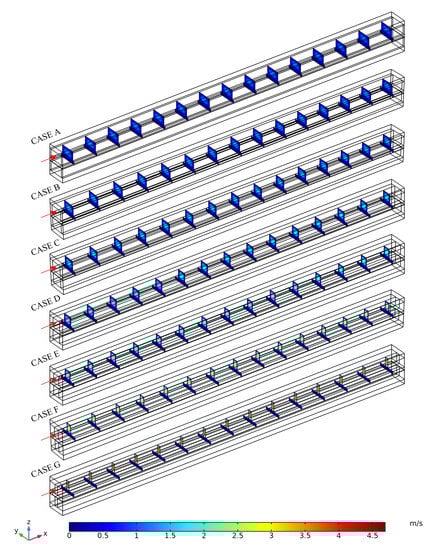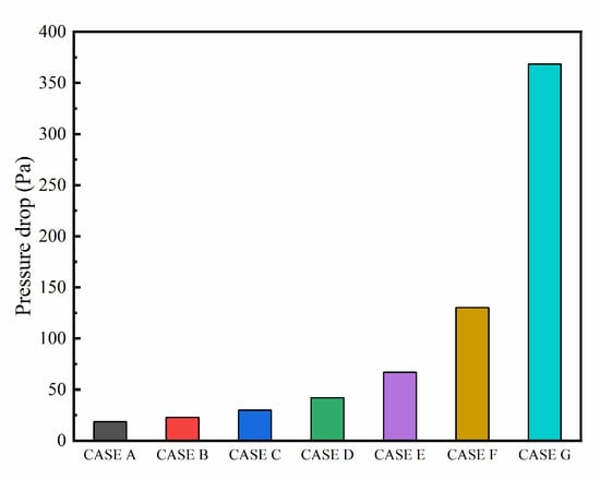 The velocity distributions in the cathode flow channel and electrode of SOECs with different rib widths are presented in Figure 7. In this figure, the x-axis is the direction of gas flow, the y-axis is the direction of cell width, and the z-axis is the direction of cell thickness. The velocity in the electrode is very small, and the gas transport is mainly dominated by the diffusion process. The maximum velocity is observed in the flow channel center, and it is also increased from CASE A to CASE G. This is because the rib width is increased and then the flow channel area is decreased. A constant mass flow rate is specified at the inlet of the flow channel, and the velocity is accordingly increased. The cathode flow channel pressure drops of the SOECs are shown in Figure 8. It is clearly observed that the pressure drop is increased from CASE A to CASE G. The pressure drops of seven cases are 18.52 Pa, 22.83 Pa, 29.77 Pa, 42.11 Pa, 66.92 Pa, 130.31 Pa, and 368.52 Pa, respectively.