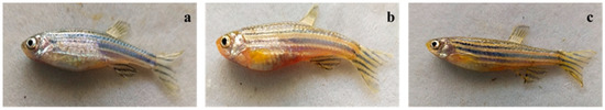 The image represents the fishes without TNBS induction, with TNBS induction, and having recovered from inflammation after treatment with the sample. (a) Fish without TNBS induction. (b) Fish with TNBS induction (1 h later). (c) Fish after TNBS induction and treatment with the compound (4 h later).
