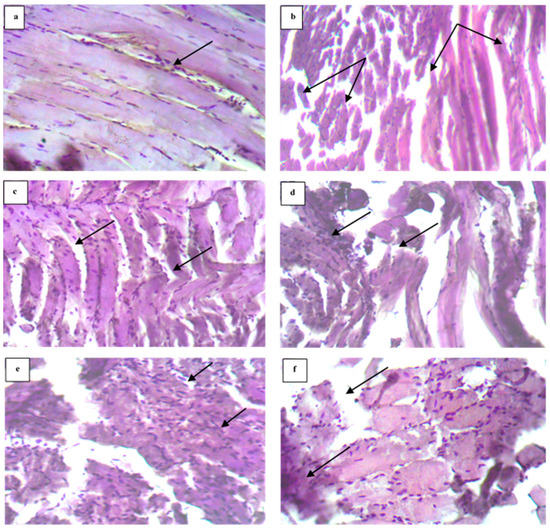 Histopathology of zebrafish muscle tissues: (a) control group; (b) induced group; (c) standard drug; (d) treated group (200 µg/mL); (e) treated group (600 µg/mL); (f) treated group (1000 µg/mL).