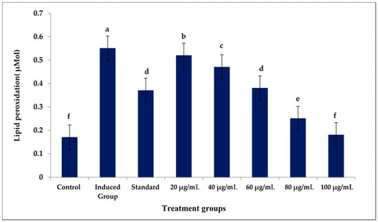 Figure 3 depicts the differences in lipid peroxidation (LPO) levels between the different groups. The control fish without TNBS induction showed 0.175 µM LPO release. The concentration of LPO increased in the induced group, whereas in the standard treatment the LPO level decreased. The samples showed decreasing LPO release in the range from 20 to 100 µg/mL. The figure shows the prominent levels of difference between the different groups. The graph depicts the evident change in the LPO when the inflammation was treated with the varied sample range, proving that there were significant differences in the LPO levels. The results showed that the lipid peroxidation effect ranged between 0.55 µMol (induced group) and 0.18 µMol (100 µg/mL group), whereas the variation between treatments (F7,39 = 449.289, p < 0.001) was highly significant. The lipid peroxidation assay was significantly related to the extent of the mycobiont extracts of the lichen. This confirms that the samples acted on the recovery at the site of inflammation induced by TNBS.
