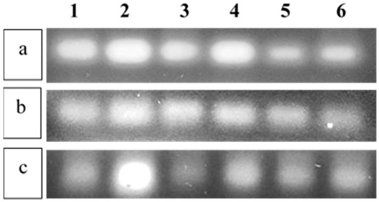 Gene expression analysis of treated fishes: (a) Beta-actin gene expression; (b) iNOS gene expression; (c) TNF-α gene expression. Lane 1—control, Lane 2—induced group, Lane 3—standard group, Lane 4—20 µg/mL, Lane 5—60 µg/mL, Lane 6—100 µg/mL.