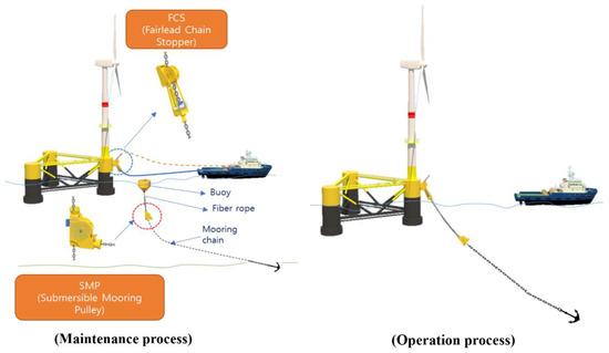 Figure 1, the FCS is designed to be installed on the side of the substructure in the mooring system designed to separate the upper and lower parts from the water surface. The FCS is connected to the tug line of the offshore support vessel during the installation and maintenance processes of the floating-type offshore wind turbine to prevent direct damage to the substructure. The FCS is also designed to be connected to the mooring chain after the installation is completed to minimize damage to the substructure due to the load of the mooring system generated during the operation of the floating-type offshore wind turbine. The SMP is designed to be installed between the buoy and the mooring chain during the installation process and connected to the FCS of the substructure during the decommissioning process. Since damage to the mooring system of floating-type offshore wind turbines usually occurs at the substructure connection, the application of a disconnectable-type mooring system eliminates the need to replace the entire mooring system during the maintenance process. Therefore, the effect of shortening the maintenance period and reducing costs due to the adoption of FCS and SMP is higher than that of a conventional mooring system.