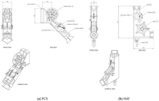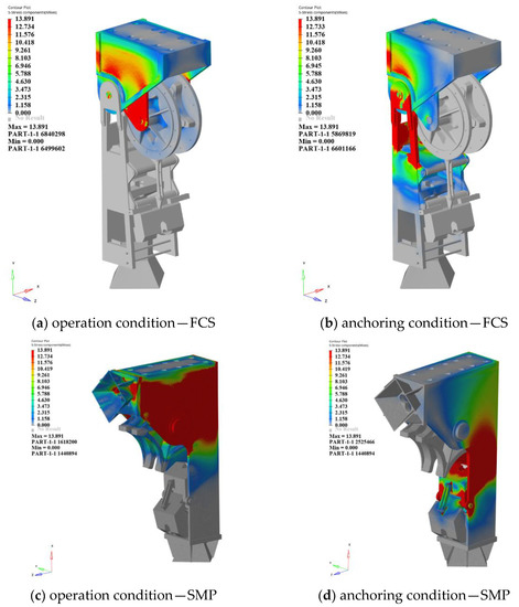 Figure 8, under the maximum forced displacement applied by the load, both the operation condition and the anchoring condition reached the maximum tensile stress of the material, which is 13.89 MPa. In this way, as the load is applied to the maximum tensile stress of the material, the structural vulnerability of each load condition can be clearly determined. In the case of FCS, the connection between the flag block and the fairlead wheel was found to be weak in the operation condition, while the connection between the fairlead arm and the chain stopper was found to be weak in the anchoring condition. In the case of SMP, the connection structure of the body and the wheel was found to be weak in the operation condition, while the connection structure of the body and the chain stopper was found to be weak in the anchoring condition.