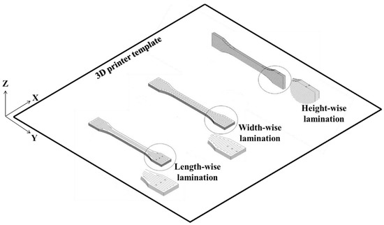 15]. Considering the geometry of three-dimensional structures such as FCS and SMP, tensile specimens of orthotropic materials should be fabricated in the length, width, and height directions of the specimen. Therefore, tensile test specimens of ABS materials were fabricated by printing out the length, width, and height directions, as shown in