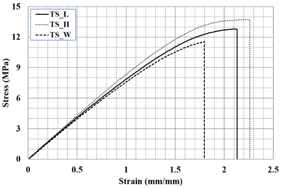Figure 5, the elongation of the specimen was measured using a contact extensometer, and the strain rate of the tensile test was set to 5 mm/min. The main results of the tensile test, such as the ultimate tensile stress, the elongation, and the modulus of elasticity, are summarized in