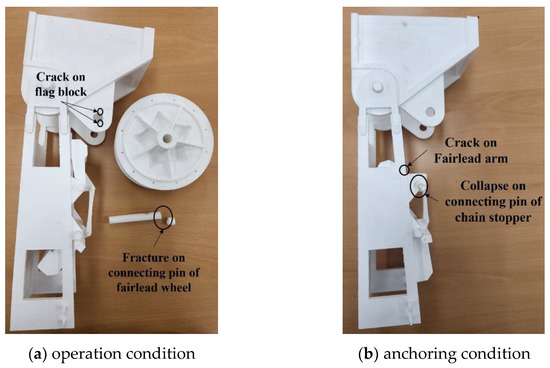 Figure 12, cracks occurred in the connecting areas between the flag block and the fairlead wheel, and the connection pin was found to be broken in the operation condition of the FCS. The connecting area and the connection pin of the fairlead arm and the chain stopper were found to be broken in the anchoring condition. The structural weaknesses of the FCS in the scaled-down model’s structural test were consistent with the results of the finite element analyses. As shown in