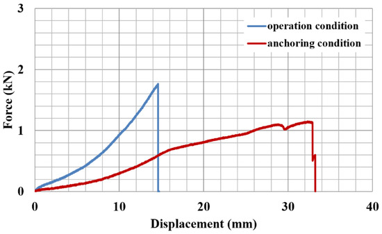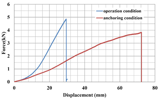 Figure 13, the maximum load and maximum displacement of the FCS in the operation condition were 1.76 kN and 15.40 mm, and the maximum load and maximum displacement in the anchoring condition were 1.15 kN and 33.45 mm. The maximum load in the anchoring condition was reduced by 35% compared to the operation condition, while the maximum displacement was increased by 117%. As shown in