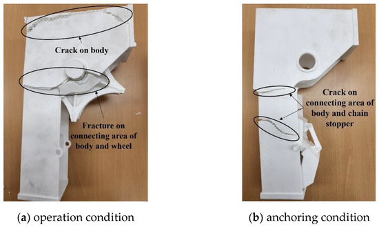 Figure 14, in the operating condition of the SMP, a fracture occurred in the connection structure between the body and the wheel, and a crack occurred in the constraint area at the top of the body. In the anchoring condition, cracks occurred in the connecting areas between the body and the chain stopper. The structural weaknesses of the SMP in the scaled-down model’s structural test were consistent with the results of the finite element analyses. As shown in