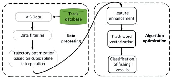 In Figure 1, the flowchart shows the fishing vessel operation classification process, divided into two parts: data processing and algorithm optimization.