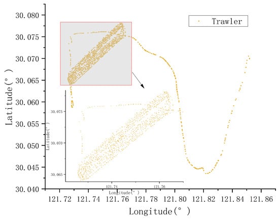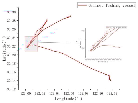 As shown in Figure 2, gillnet fishing vessels [26,27] use gillnets as fishing gear to fish in the ocean. Its navigation trajectory characteristics are as follows: