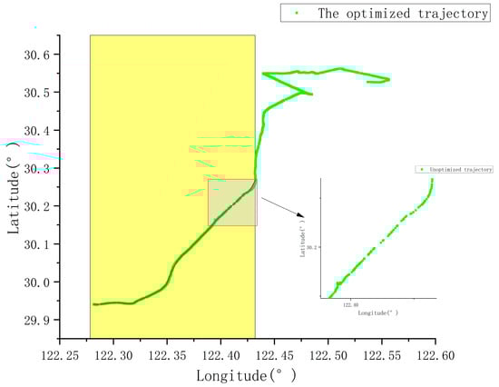 Data Processing: Firstly, extract AIS data from the database. Due to the influence of weather and other factors on communication between AIS devices and shore stations, there are abnormal points in the data. Therefore, data filtering is necessary. The filtered data are then optimized using the cubic spline interpolation algorithm three times to complete the ship’s sailing trajectory by filling in missing points.