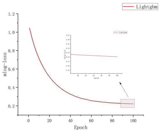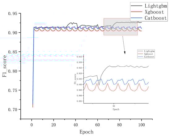 As shown in Figure 15, the training iteration is 100. The black curve represents the curve of the LightGBM algorithm, the red curve represents the curve of the XgBoost algorithm, and the blue curve represents the curve of the CatBoost algorithm. The black curve in the figure is the optimized curve of the algorithm used in this paper, and the red and blue curves are the curves that have not been optimized using the algorithm proposed in this paper. It can be seen from the figure that the XgBoost algorithm has the smallest , with a value of around 0.907; the of the CatBoost algorithm is around 0.913, and the of the LightGBM algorithm is the highest, with a value of about 0.925.