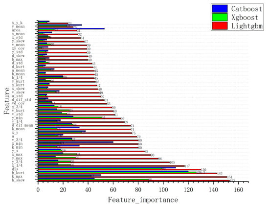 The proportion of feature importance of the three algorithms. x represents longitude, y represents latitude, v represents speed, k represents the ratio of latitude to longitude, b represents the difference between latitude and longitude multiplied by the average value of k. Other values include : the mean value of k, min: minimum value, max: maximum value, mean: mean value, : percentile, : percentile, std: standard deviation, cov: covariance, kurt: kurtosis, skew: skewness.