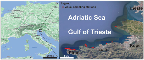 The Gulf of Trieste (Figure 1) is a shallow semi-enclosed basin in the northernmost part of the Adriatic Sea with a maximum depth of 33 m. It is characterized by the largest tidal amplitudes (67 cm on average [31]) and the lowest winter temperatures (7 °C on average [32]) in the Mediterranean Sea [33]. The area is known by high oscillations in temperature and salinity and the important stratification of the water column in the warmer period of the year. Salinity, which is, on average, around 37% [32], is influenced by freshwater inputs, mainly from the Isonzo River [34], while the water circulation is mainly counter clockwise in the lower layer and clockwise in the surface layer [35]. The rocky bottom is made mainly of Eocene Flysch layers with alternating solid sandstone and soft marl [36]. The Slovenian coastal sea covers the southern part of the Gulf of Trieste, with the coastline approximately 46 km long.