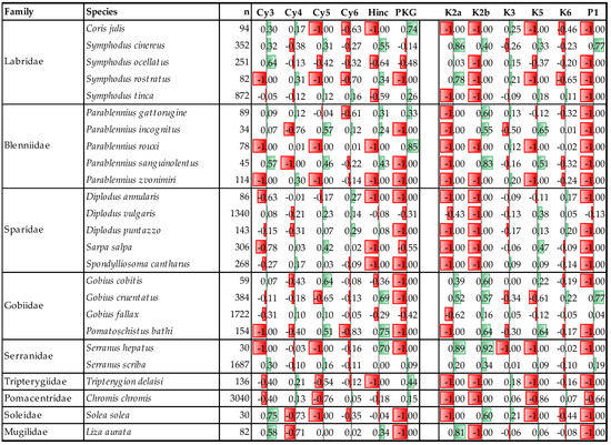Results indicate that different fish species prefer different environments, which correlates with the electivity index values in Figure 2. Labrids and sparids inhabit Cystoseira belts, but they can also be found in deeper environments (PKG) with larger substrate (K3). Gobiids avoid densely vegetated habitats and prefer finer and smaller substrates. Blenniids are the most dynamic coastal fish group in terms of habitat preference. Some species are linked to Cystoseira belts (e.g., Parablennius incognitus and P. sanguinolentus) on large substrate structures (K5), others can be found in deeper water near large rocks 30–50 cm bare or covered by turf (P. rouxi and P. zvonimiri) (K3), or in the shallows alongside small stones (Parablennius gattorugine) (K2a). Triplefin blennies clearly differ in habitat selection as well. Tripterygion tripteronotus can be found on sandstone terraces with dense Cystoseira (Cy5), whereas T. delaisi mostly utilizes the deeper-laying precoralligenous habitat (PKG).