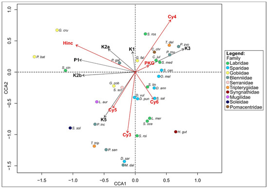 In the first step, fish species abundance and composition per habitat type (algal cover (Cy3, Cy4, Cy5, Cy6, Hinc, and PKG) or substrate structure (K2a, K2b, K3, K5, K6, and P1])) was studied by organizing all collected data into a frequency table. Frequency of occurrence (FO% = 100 × A/a, where a is the number of transects where certain species was caught, and A is the total number of transects) and relative abundance (N% = n/N; as the number of individuals of certain species divided with the abundance of specimens of all species) was calculated to distinguish between rare (<1%) and dominant (>10%) species [53,54]. In addition, mean and maximum fish density (d = 100 × (n/S), as the number of fish individuals (n) per 100 m2 of the sampled area (S)) for the consecutive year, were calculated as well to detect trends in fish occurrence and density. Next, the relative habitat use of all fish species was measured with Ivlev’s electivity index (s) [55,56,57]. The electivity index was calculated as E = (ri − pi)/(ri + pi), where ri is the percentage of fish species using a given habitat and pi is the total percentage of habitat type in the studied environment [58]. The s values for each fish species per habitat type (algal cover or substrate structure) varied between −1.0 (never used) and +1.0 (exclusively used), with 0.0 representing no habitat preference [55,59]. Moreover, the relationship between habitat types (algal cover (Cy3, Cy4, Cy5, Cy6, Hinc, and PKG) or substrate structure (K2a, K2b, K3, K5, K6 and P1)) and coastal fish species were further explored with the Canonical Correspondence Analysis (CCA) and the redundancy analysis (RDA) with the vegan package in the R environment [60]. We tested how much variation in fish assemblage could be explained by habitat type (algal cover) and substrate structure. Prior to ordination analysis, fish abundance data were Hellinger transformed by applying the decosdtand algorithm in the vegan package. Thus, the weight of abundant species was reduced while Euclidean distances between samples in the multidimensional space were simultaneously preserved [61]. The significance of constraints in the produced CCA model (by = ”term”) were tested with the anova function within vegan, which automatically chooses the correct variant for the result of constrained ordination.
