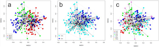 To visualize potential differences in fish assemblage composition in regard to factors year (2019, 2020 and 2021), depth (<3 m and >3 m), and algal cover (Cy3, Cy4, Cy5, Cy6, Hinc, and PKG), the non-metric multidimensional scaling analysis (NMDS) was performed by applying vegdist (method = bray) and metaMDS functions in the vegan package [62]. The multivariate permutation analysis of variance (PERMANOVA; 999 permutations) revealed in the next step if above mentioned factors significantly contributed to coastal fish community differentiation. In addition to the PERMANOVA function adonis in the vegan package, the betadisper and permutest algorithms were applied to test the multivariate homogeneity of group and permutation dispersion. If both tests were insignificant (p > α; α = 0.05), the simper function was used to find key contributors to the discovered differences in the fish community by factors (year, depth, and algal cover).