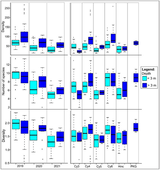 After identifying significant coastal fish community differentiating factors, the research focus turned to overall diversity. Figure 5 shows how the dependent variables: coastal fish density (number per 100 m−2), number of species and fish diversity (Shannon index), varied in relation to year, depth, and habitat type (algal cover). Coastal fish density was significantly higher (p > α; α = 0.05) in waters deeper than 3 m, with the exception of habitat types Cy3 (rocks with dense Cystoseira s.l.) and Hinc1 (rocks, terraces, or boulders with Halopithys incurva), and a marked decrease with years was observed in both depth categories. Species numbers clearly differed between depths only in habitats Cy3, Cy4, and Hinc1, and it showed an even more pronounced downward trend from 2019 to 2021. Species diversity did not differ significantly with depth but differed significantly among all habitat types and decreased dramatically over time. The highest coastal fish diversity was detected in habitats PKG and Cy4.