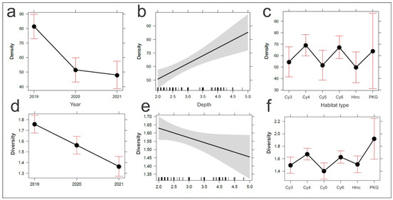 GLM effect plots of factors year (a,d), depth (b,e), and habitat type (algal cover) (c,f) with regard to fish density and diversity.