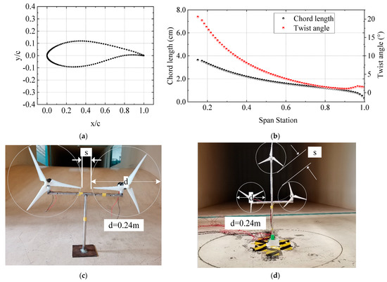 Multi-rotor wind turbines (a) airfoil geometry; (b) blade parameters (D = 0.4 m); (c) double-rotor wind turbine; (d) triple-rotor wind turbine.