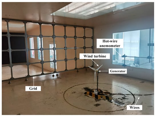 For flow field measurements, the sample time was 20 s, and the sampling frequency was 5 kHz. A single measurement point yielded a total of 100,000 data points. Before flow field data could be gathered, pitot tubes were utilized to measure the average wind speed at the wind rotor portion and stabilize it around the test wind speed of 10 m/s. References [37,38] contained a description of the detailed design. After the flow field measurement was completed, the T.I. of each measuring point was calculated by the formula. The base T.I. of the free wind tunnel was 0.2%. The grid adopted in this paper corresponds to scheme I (the width and thickness of the aluminum alloy grid both were 3 cm). The turbulence intensity measured was 1.6 m behind the grid, and the average T.I. and integral scale streamwise were 10.5% and 0.0648 m, respectively.