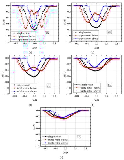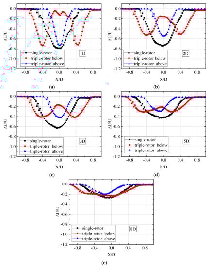 Figure 6, Figure 7 and Figure 8 compared the wake velocity profiles for line 1 and line 2 of the triple-rotor wind turbine and the equivalent swept area of a single-rotor wind turbine for s/d equal to 0.1, 0.4, and 0.9, respectively. The measuring lines 1 and 2 of the triple-rotor wind turbines were at the height of the rotor hub listed above and below, respectively. As shown on the axes in these figures, the X-direction was the horizontal direction of the cross-section, and the measuring position was at the positive center of the hub of the single-rotor wind turbine or at the symmetrical center of the two hubs of the double-rotor wind turbine when X was zero. The flow passing through the rotor, part of the energy used to do work for the wind rotor, makes the fluid speed less than the inflow velocity, thus forming a velocity deficit phenomenon. It was evident from Figure 6, Figure 7 and Figure 8 that the wake velocity deficit value ∆U/U decreased with increasing axial distance, which showed that the wake velocity of the wind turbine had gradually recovered.
