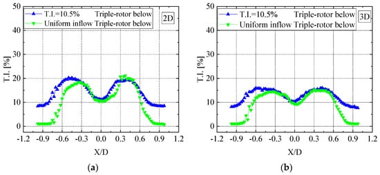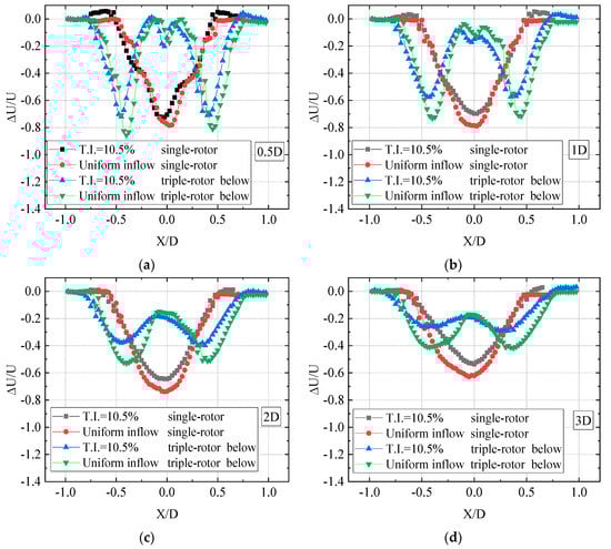 The comparison of the wake velocity deficit between the triple-rotor and the single-rotor wind turbine is shown in Figure 9 for uniform flow case and turbulent intensity of 10.5%, respectively. The wake velocity deficit under the condition of T.I. = 10.5% was smaller than that of uniform inflow, indicating that the wake recovery of wind turbines under turbulent conditions was quicker than that of uniform inflow. Turbulence reflected the intensity of the fluctuating velocity. The greater the T.I., the greater the velocity fluctuation, thus increasing the penetration collision probability and impacting the intensity of the tip vortex, bound vortex, and center vortex generated by air flowing through blades. In this process, the wake was thoroughly merged and fused, and finally, the wind speed recovered rapidly and tended to be uniform, which was also the reason why the wake recovery was quicker in turbulent than in uniform inflow. It also can be seen from the figure that the velocity deficit of the wake of the triple-rotor wind turbine under turbulent conditions is significantly lower than that of the uniform flow. Compared with a single-rotor, the difference between the triple-rotor wind turbines was more obvious, especially at the positions of 2D and 3D. This demonstrated that turbulence had a higher impact on the triple-rotor’s wake recovery rate than it did on the single-rotor wind turbine. Possibly, this behavior could be explained by the fact that the wake vortex collisions of triple-rotor wind turbines were more apparent in turbulent conditions than they were for single-rotor turbines, necessitating a closer analysis of the T.I. in the wake.