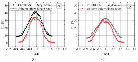 Figure 10 and Figure 11 show the turbulence intensity for single-rotor and triple-rotor wind turbines at the 2D and 3D positions, respectively. As shown in the figure, the single-rotor wind turbine had a higher T.I. than the triple-rotor wind turbine in the wake. Compared with the single rotor of the triple-rotor wind turbine, part of the energy flowing through the single-rotor wind turbine of the equal swept area did more work on the rotor than that of the single rotor of the triple-rotor wind turbine, which made the central wake area formed by the single-rotor wind turbine larger and generated more vortices, including tip vortices, bound vortices, and center vortices, and finally made the T.I. greater. Secondly, the figure also shows that the T.I. of the high turbulent condition was lower than 10.5% at the edge position, and the value was smaller in 3D compared to 2D, which was due to the fact that the turbulence intensity decreased with the increase in the axial distance. In addition, the turbulences inside and outside the wake region could exchange momentum.