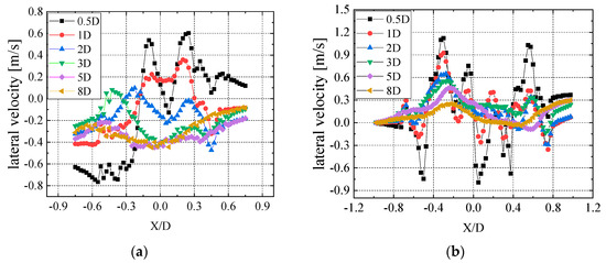 Figure 12 shows the lateral wake characteristics for single-rotor and triple-rotor wind turbines. From this figure, we can see that the lateral wake of the single-rotor wind turbine and the multi-rotor wind turbine decreased with increasing axial distance, which has a similar rule to the streamwise velocity. However, the difference was that the streamwise wake gradually returned to the incoming flow speed as the surrounding wind speed replenished. In contrast, the lateral wake speed weakened as the surrounding uniform wind speed was replenished until it tended to zero (uniform incoming lateral velocity was essentially zero). Positive and negative signs represent the direction of the lateral wake. The left represents the negative, whereas the right is positive when facing the incoming flow.