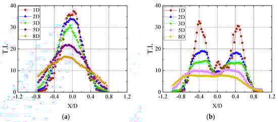T.I. at different axial distances of the triple-rotor wind turbine. (a) Y = 2D; (b) Y = 3D.