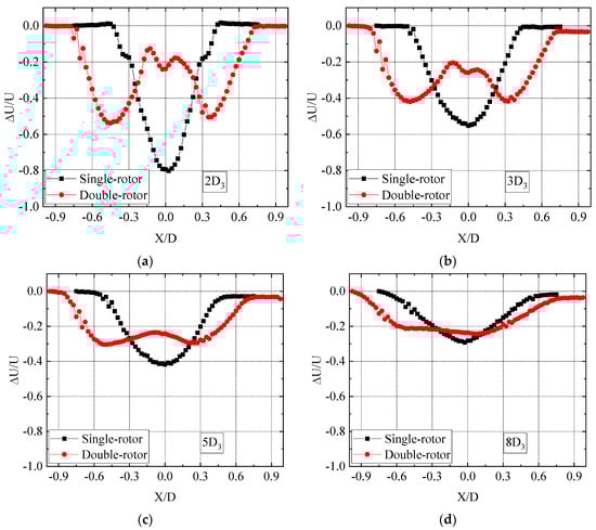Wake velocity curve of single-rotor and equal swept area of double-rotor when s/d = 0.4. (a) 2D3; (b) 3D3; (c) 5D3; (d) 8D3.