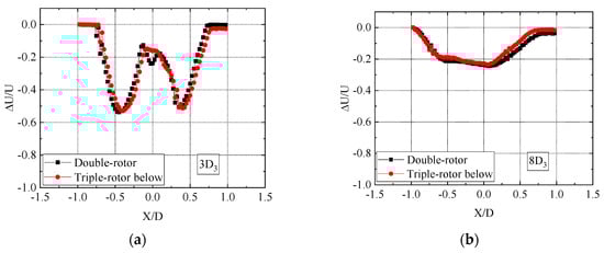 The velocity deficit of double-rotor and triple-rotor wind turbines at the same position when s/d = 0.4. (a) Y = 3D3; (b) Y = 8D3.