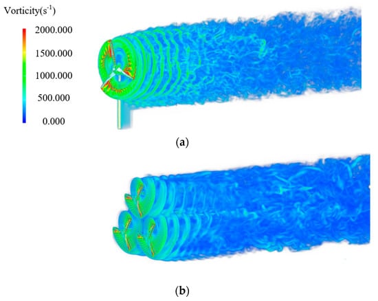 Besides, by using XFlow software, we simulated the condition of the wind tunnel test to perform a numerical analysis (see Figure 16). The vortex structures of the single-rotor wind turbine and the triple-rotor wind turbine were analyzed. Comparing single-rotor wind turbines with triple-rotor wind turbines, single-rotor wind turbines have more turns of vortex development at the tip of the blade than triple-rotor wind turbines. This is mainly because the rotation speed of each wind rotor of the triple-rotor wind turbine is faster than that of the single-rotor wind turbine, which makes the tail vortex break up more quickly. The obvious stratification of the wake velocity at the beginning and the irregularity of the wake velocity after a certain axial distance. From the vortex structure of the triple-rotor wind turbine, it can be seen that the vortices of each small wind turbine have overlapping parts, which indicates that the vortices of each wind turbine of the triple-rotor wind turbine interact with each other, so the collapse of the vortex structure occurs faster, which is also an explanation for the faster recovery of the wake velocity of the triple-rotor wind turbine.