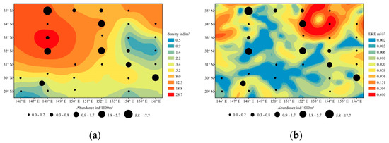 The copepod density had significant gravity of distribution, with the highest density occurring at around 148° E, 33° N and gradually decreasing in regions far away from the center (Figure 5a). The suitable copepod density range was 15–20 ind/m3. There were three obvious mesoscale eddies and a part of the KE (Figure 5b). The highest abundance station was located on the edge of the KE, and the highest abundance was distributed in the low EKE region. In vertical tows, the highest abundance was distributed in the region with the high copepod density (Figure 6a). As shown in Figure 6b,c, overall, the Chl−a was significantly higher in the north than in the south of the sampling region, while SST in the north was lower than that in the south, and the highest abundance was distributed in the transition zone of Chl−a and SST.