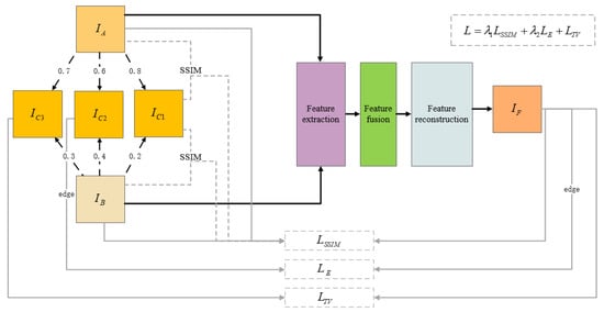In FSSIM, the image IC1 is obtained by adding image IA and IB, which can be changed by adjusting the contribution of IA and IB. Image IC1 is treated as a kind of scale, and its similarity with images IA and IB is compared in the sliding window. The parts of images IA and IB with high similarity to IC1 are selected to form a loss with the final fused image IF. The FSSIM is shown in Equation (3).