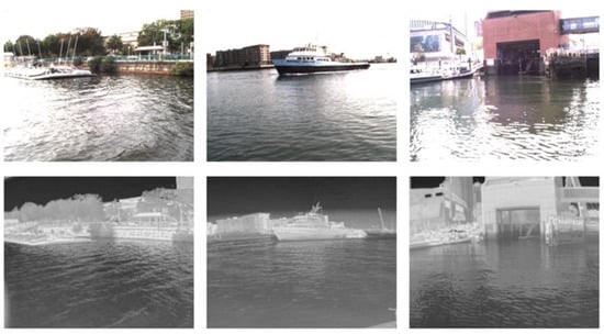 A total of 2000 pairs of infrared and visible images were selected from the MIT Sea Grant Marine Autonomy Dataset Project. The dataset contains the viewpoint data of the ship in different locations and light conditions. The images were adjusted to 512 × 512 and used for training without any manual annotation. In addition, the network was trained for 200 epochs, and the loss was minimized using the Adam optimizer with a learning rate of 10−2. Our network was implemented on PyTorch [] and trained on a PC with an Intel(R) Xeon(R) Gold 5320 2.20 GHz CPU, 32 GB RAM, and an NVIDIA RTX A4000 GPU.