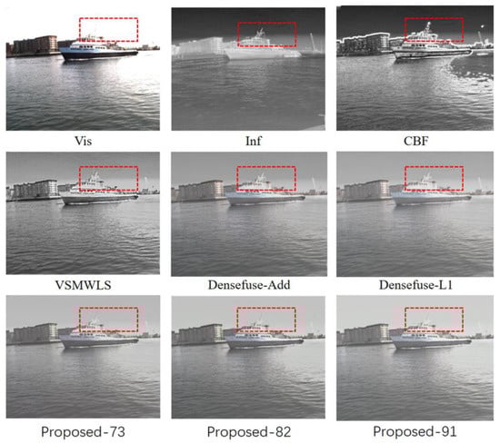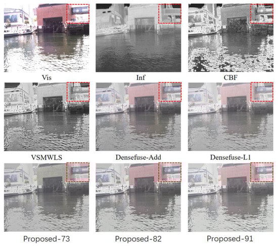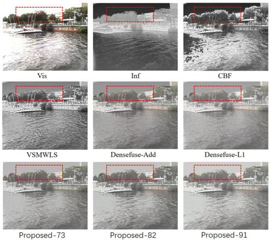Several algorithms are selected for comparison in the experiments, including CBF [], VSMWLS [], Densefuse-Add [], and Densefuse-L1 []. All four comparative methods were implemented based on publicly available codes, where the parameters were set according to the original papers. Several different IC1 images are compared to comprehend the impact of various IC1 images on the final fusion effect. For instance, Proposed-73 denotes that 70% of image IA and 30% of image IB are added to create IC1. Proposed-82 and Proposed-91 are defined in the same way as Proposed-73. The comparison results are shown in Figure 4, Figure 5 and Figure 6. Areas that need to be highlighted are marked by red dashed boxes.