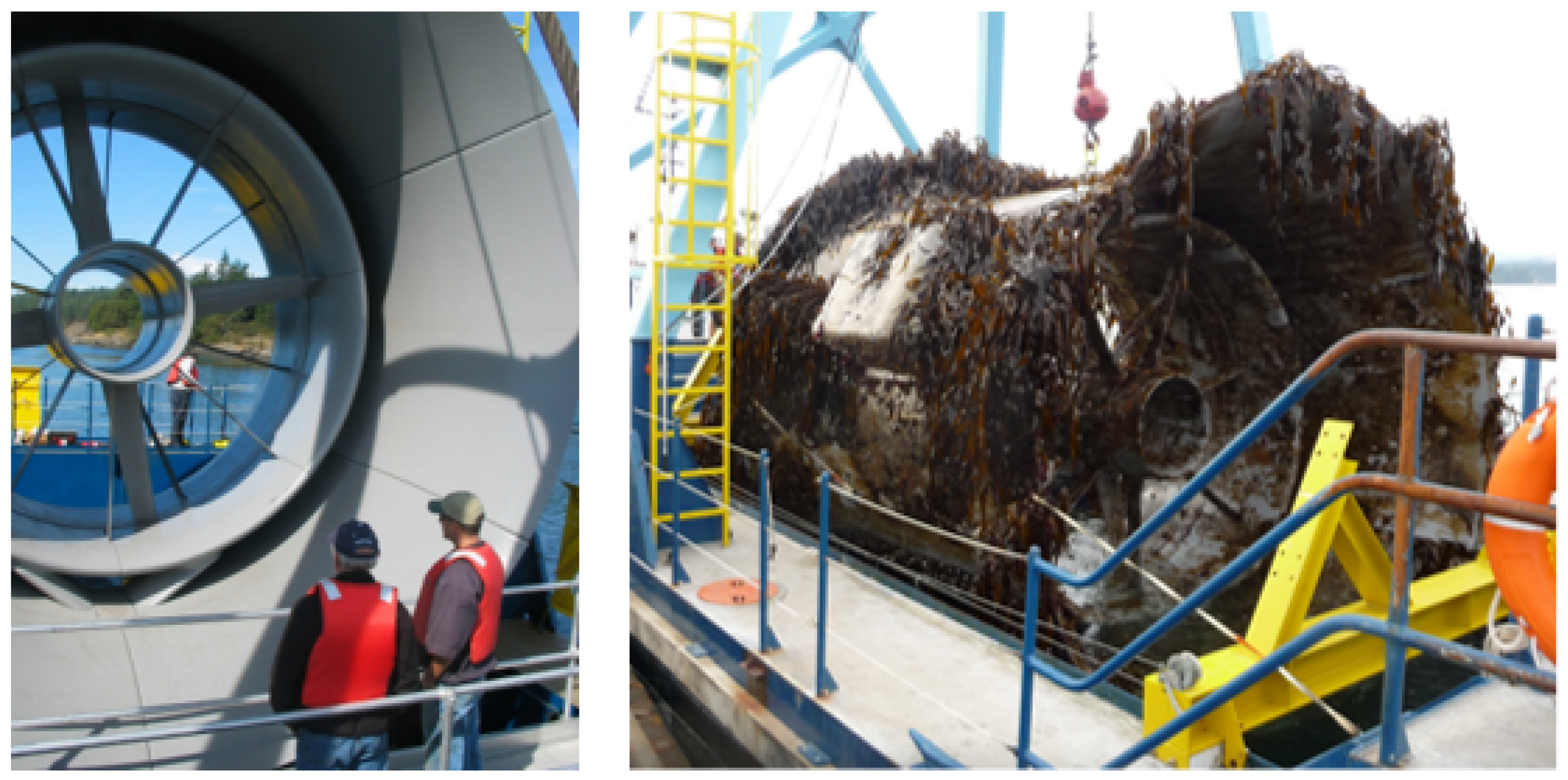 Figure 4. The Clear Current Company tidal stream turbine: Immersed in September 2006 and retrieved in October 2011 due to loss of performance. Reproduced from [20].