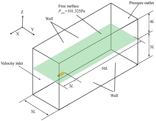 Understanding the dynamic behavior of the ventilated cavity around a submarine body requires knowledge of its internal flow and 3D geometry under different flow conditions [19]. However, experimental measurement of this information is challenging. Instead, numerical simulations offer a more effective way to obtain accurate gas leakage behavior, geometry, and internal flow structure of the cavity, enabling a deeper understanding and analysis of its behavior [20,21,22]. The numerical simulation can also provide a good analysis of the transient fluid dynamics of the cavity, including pressure, velocity, wake, and vorticity field [23,24].