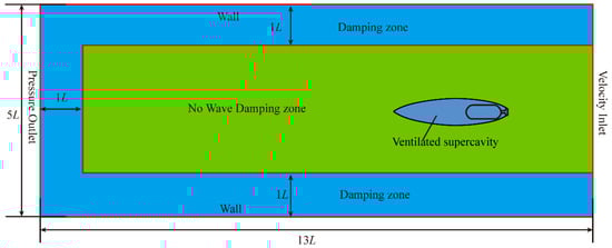 Figure 2 displays the computational domain and boundary conditions. The free surface was kept stationary in the calculation, and the immersion depth was altered by adjusting the position of the model. The model is located within a rectangular parallelepiped with dimensions of 7 L in height, 5 L in width, and 13 L in length. Here, L represents the total length of the model, which is L = 90 mm. The blockage ratio () is far less than this value (5%), so the size of the computational domain will not affect the results [13]. At the inlet boundary, a uniform inflow condition is exerted with an inflow velocity of U = 4 m/s (based on experimental settings). The pressure outlet is set to a linear pressure proportional to the immersion depth, where the reference pressure is the free surface pressure, Patm = 101,325 Pa. All other boundaries and the model’s surface are defined as no-slip walls. To prevent reflected free surface waves, a wave damping region with a length of L is imposed close to the outlet boundary and sidewalls, as illustrated in Figure 3.