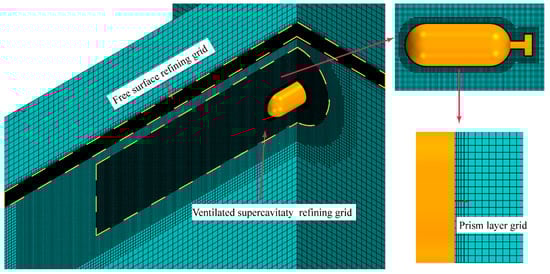 The grid details are presented in Figure 5. To obtain high-resolution calculations for the ventilated supercavity and free surface, the Cartesian grid method with grid refinement was employed. A prism layer mesh and trimmed grid were subsequently established based on the surface grid to construct the volume grid. Regarding the near-wall grid, the boundary layer has 5 layers at a growth rate of 1.2, and thus the total thickness is 0.001 m. As recommended by Lv et al., the value of y + at the wall surface of the body is smaller than 60 [25]. Furthermore, the grid size around the model in the radial direction was approximately 1 × 10−3 m. Additionally, a finer grid was adopted close to the free surface with a sizing of 5 × 10−4 m. This complies with the suggested grid resolution for free surfaces set by ITTC [45].