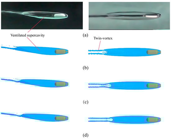Comparison of the ventilated supercavity under fully submerged conditions ( = 10.4, = 0.25, c = 0.08, h* = 16.7), where the ventilated supercavity obtained from numerical simulations is shown using blue isosurface (αv = 0.1). (a) Experiment, (b) coarse, (c) medium, (d) fine grid.