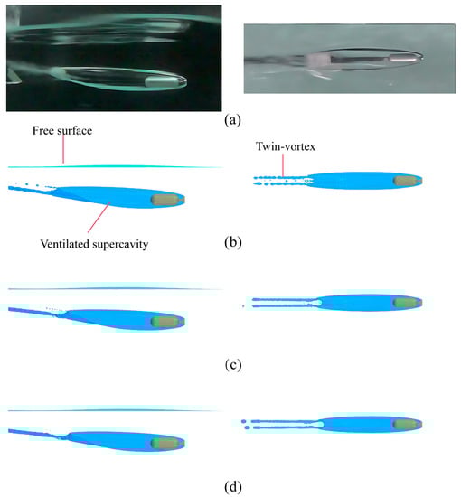 Comparison of the ventilated supercavity obtained from the experiments and numerical simulations. (a) Fully submerged condition ( = 10.4, = 0.25, c = 0.08, h* = 16.7); (b) shallowly submerged condition ( = 10.4, = 0.25, c = 0.08, h* = 5.7).